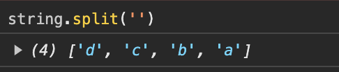 split์ ๊ธฐ๋ณธ ๋ฌธ๋ฒ์ `split(separator)`์ผ๋ก, separator ๊ธฐ์ค์ผ๋ก ์ด๋ป๊ฒ ๋ฐฐ์ด์ ๋๋๊ฑด์ง ์ ํด์ค ์ ์๋๋ฐ, `string.split('')`์ผ๋ก ์ ์ด์ค๋ค๋ฉด string์ธ 'dcba'๋ฅผ ' ํ ์ ํ ์ ๋ถ๋ฆฌํ๋ค, ์ชผ๊ฐ ๋ค๋ ์๋ฏธ๊ฐ ๋๋ค.