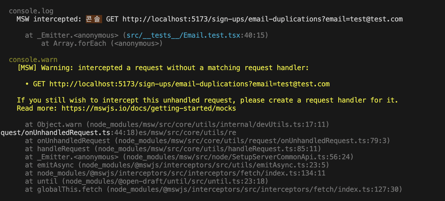 ํ ์คํธํ๋ Email ํ์ด์ง์ msw ํธ๋ค๋ฌ์ ์๋ฒ ์๋ต์ ๋ฐ์์ค๋ ์ฝ๋๊ฐ ์๋๋ฐ, ์๋ฌด๋ฆฌ ํ ์คํธ๋ฅผ ๋๋ ค๋ ๊ณ์ ํ ์คํธ๊ฐ ์คํจํ๋ค.