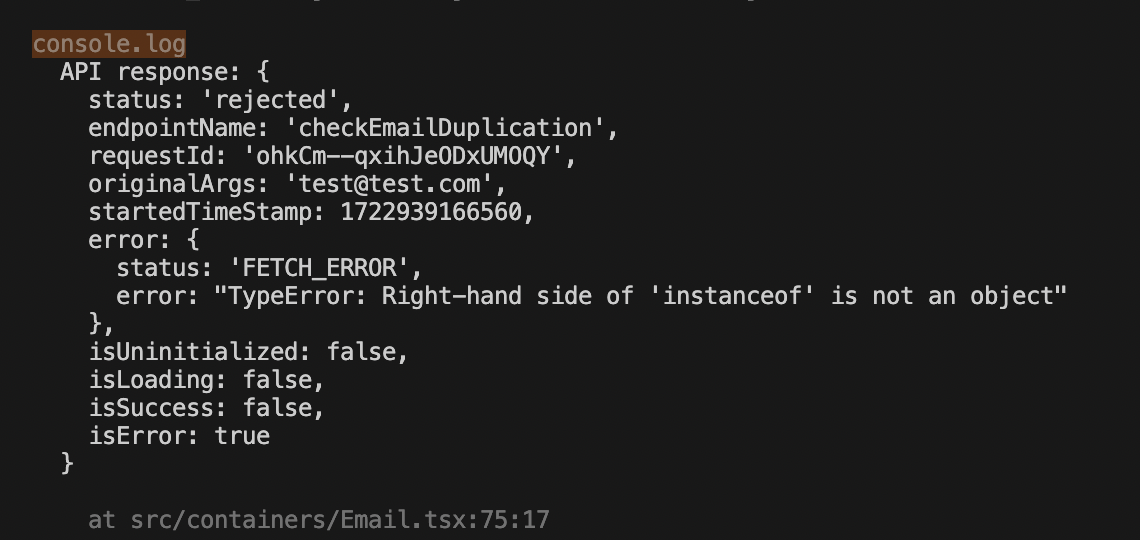 - ์ปดํฌ๋ํธ ๊ตฌํ๋ถ์์ console๋ก ๋๋ฒ๊น ํด๋ณด๋, api ์๋ต์ด ์ฑ๊ณตํ์ง ์๊ณ ์๋ฌ๋ก FETCH_ERROR ์ํ๊ฐ ๋ค์ด์ค๋ ๊ฒ์ ๋ณผ ์ ์๋ค.