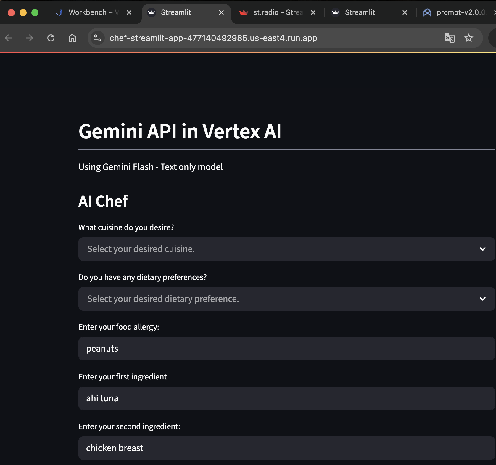There was also Cloud Shell Editor (along with Cloud Shell Terminal) on the interface, which is like web-based VScode environment, and I found it was much easier to understand the code and structures than just Terminal. So there, I added the radio button option for users to choose wine preferences, as well as the new Gemini prompt starting to say that "I am a Chef. I need to create recipes..."