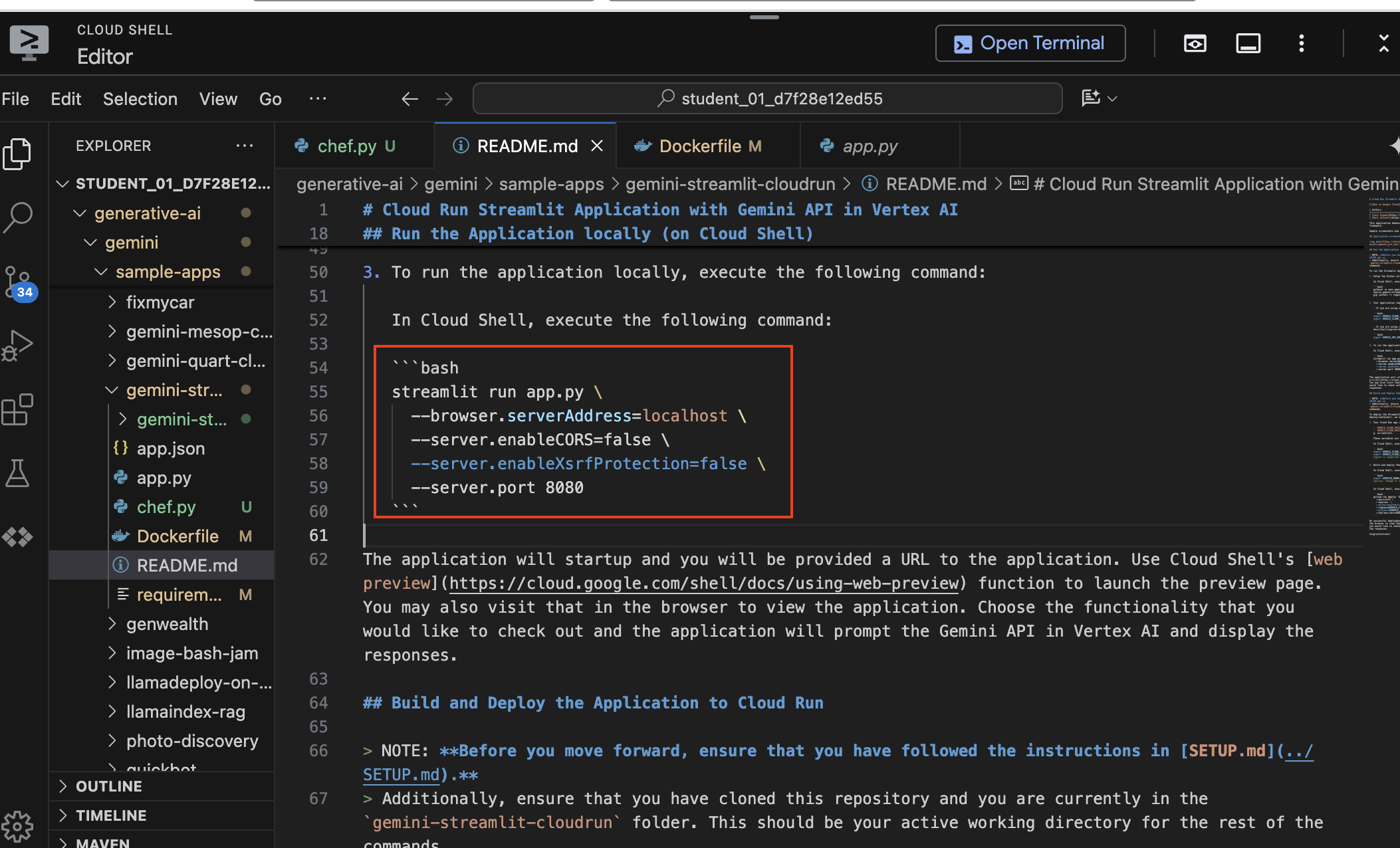 Next, in order to run the app using Cloud Shell Terminal, I first just typed below command.