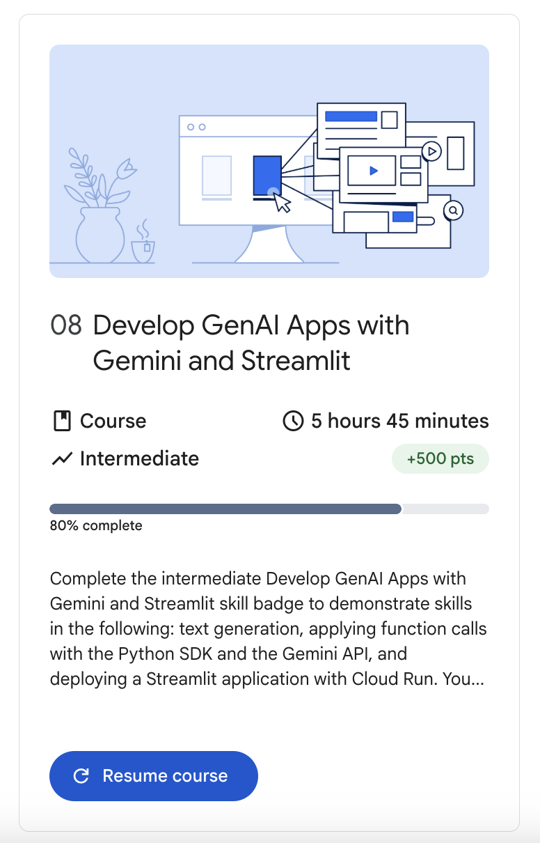 The "Develop GenAI Apps with Gemini and Streamlit" cousre covers Python SDK, Gemini API, and deploying a Streamlit web app with Could Run.