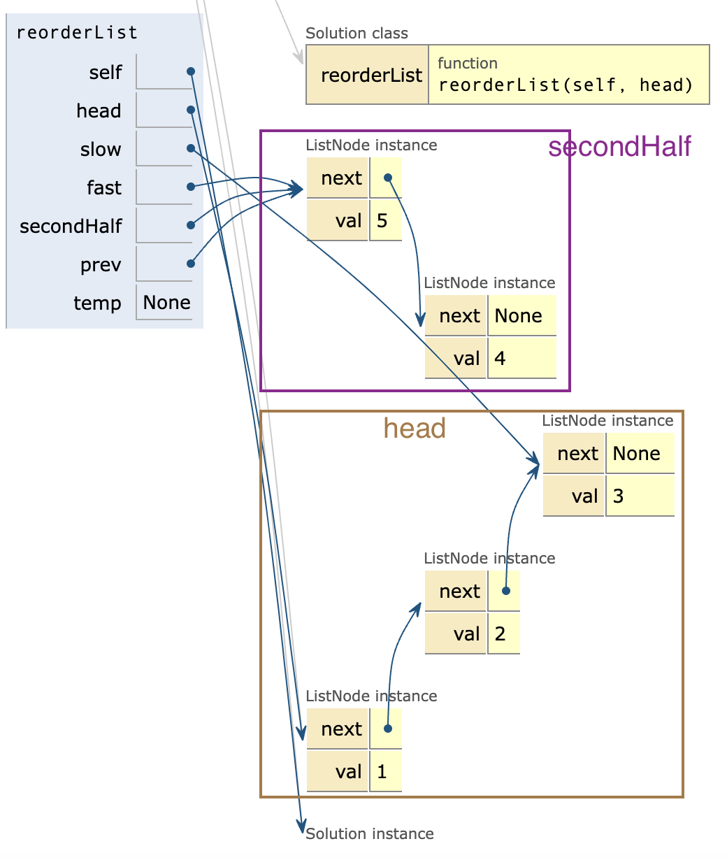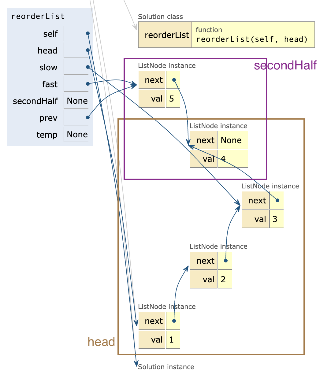 slow.next = None ์ฒ๋ฆฌ๋ฅผ ํ๊ณ ๋ ์ดํ์ second half ๋ฅผ ๋ค์ง์ด์ฃผ๋ ์ฝ๋๋ฅผ 25๋ฒ์งธ ์ค๊น์ง ์คํํ๊ณ ๋๋ฉด ์ ์บก์ฒ์ฒ๋ผ ์ฒซ๋ฒ์งธ๋ถ๋ถ์ ๋ง์ง๋ง ๋ ธ๋.next๋ None ์ผ๋ก ๋๋๊ณ , ๋๋ฒ์งธ ๋ถ๋ถ์ ๋ง์ง๋ง๋ ธ๋.next๋ None ์ผ๋ก ๋๋จ์ ๋ณผ ์์๋ค.