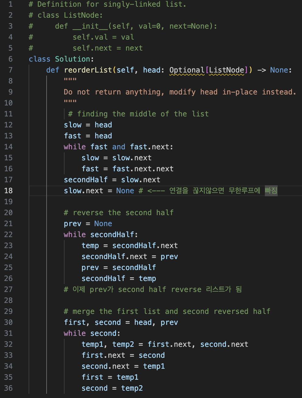 ์ด๋ ๊ธฐ์ head๋ฅผ ์๋ถ๋ถ๊น์ง ์๋ฅด๊ธฐ์ํด์ slow.next = None ์ฒ๋ฆฌ๋ฅผ ํด์ฃผ์ด์ผํ๋ค.