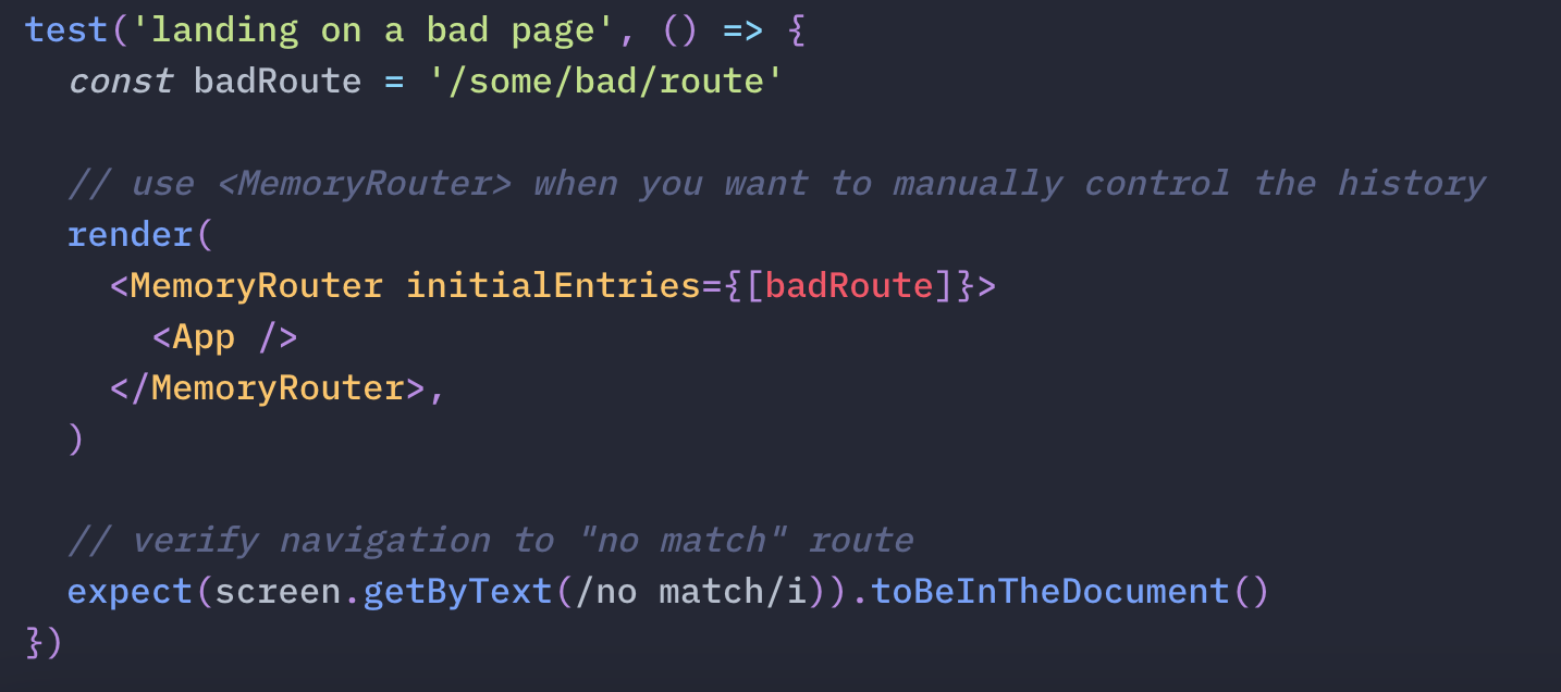 ์คํธํ ๋๋ history stack์ ์์ ํ ์ ์ดํ ์ ์๋ `<MemoryRouter>`๋ฅผ ์ฌ์ฉํ๋๊ฒ ์ด์์ ์ด๋ผ๊ณ ๊ณต์๋ฌธ์์์ ์ค๋ช