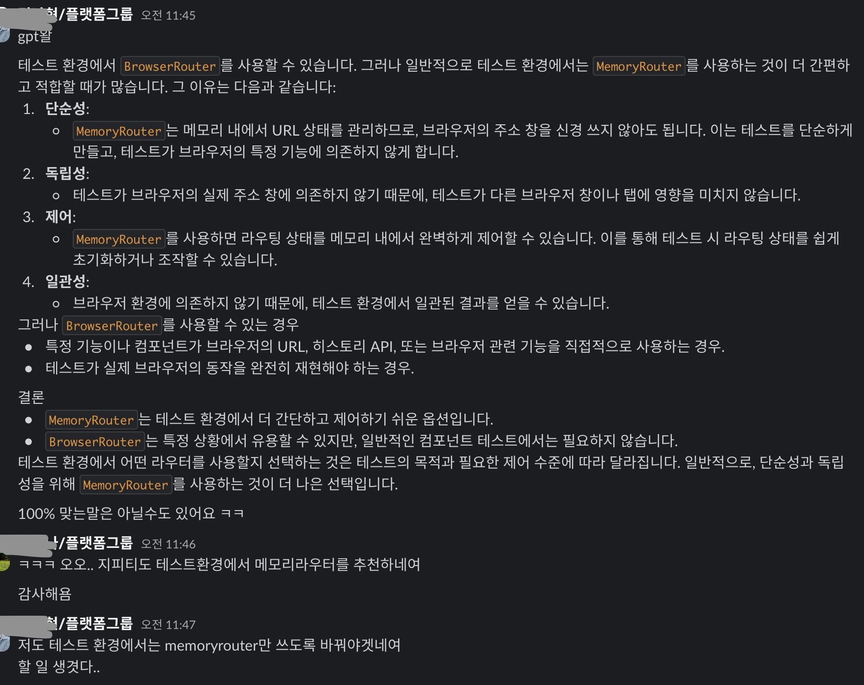 ๊ฒฐ๊ตญ `<MemoryRouter>`๋ ๋ฉ๋ชจ๋ฆฌ ํ์คํ ๋ฆฌ ์คํ์ผ๋ก url์ ๊ด๋ฆฌํ๋ฏ๋ก, ๋ด๋ถ์ ์ผ๋ก BrowserRouter๋ก ์ปดํฌ๋ํธ๊ฐ ๊ตฌํ์ด ๋์๋ค๊ณ ํด๋ ํ ์คํธํ๊ฒฝ์์๋ `<MemoryRouter>`๋ฅผ ์ฌ์ฉํ๋๊ฒ ์ธ๋ถ ์์ค์ ์์กดํ์ง ์๊ธฐ๋๋ฌธ์ ๋ ์ผ๊ด์ฑ์๊ฒ ์ ์ดํ๊ธฐ ์ฝ๋ค.